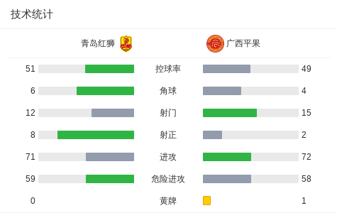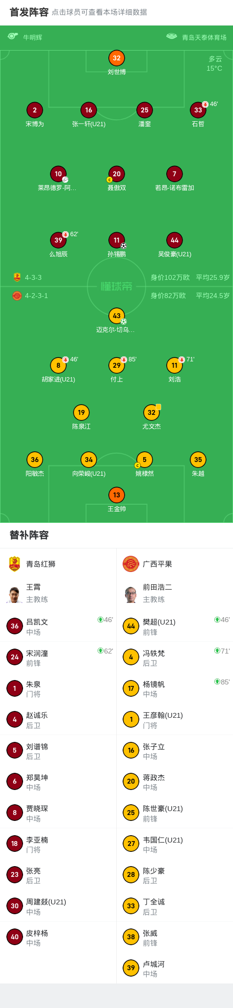 北京时间10月12日中国足球甲级联赛 联赛 第26轮,青岛红狮主场对阵广西平果。青岛红狮孙锡鹏破门。广西平果迈克尔-切乌库阿破门。最终比分青岛红狮 1-1 广西平果。